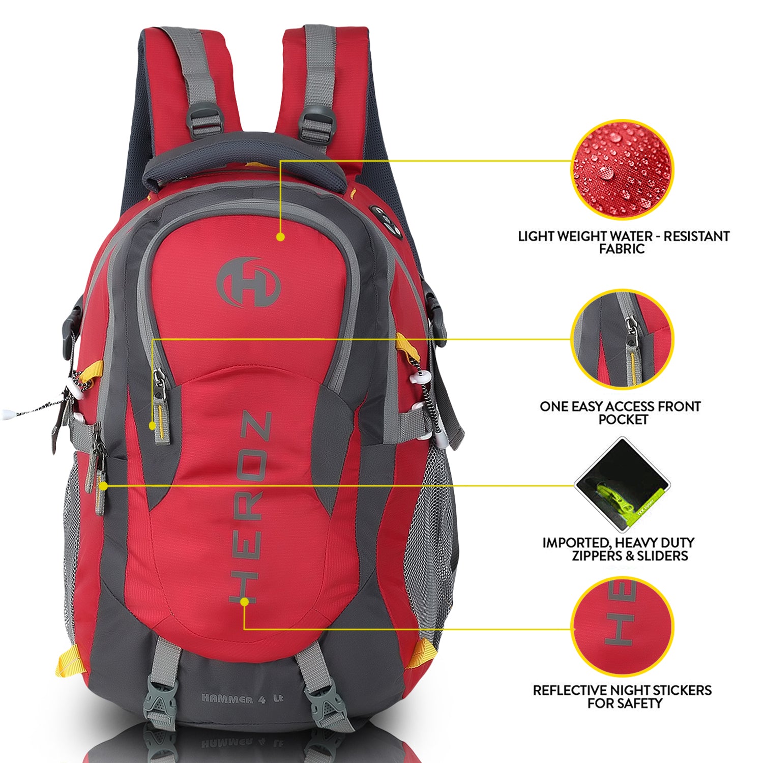 HEROZ Hammer Unisex Nylon 45 L Travel Laptop Backpack for Men – Water Resistant, Slim & Durable, Fits Up to 17.3 Inch Laptop (Grey & Red)