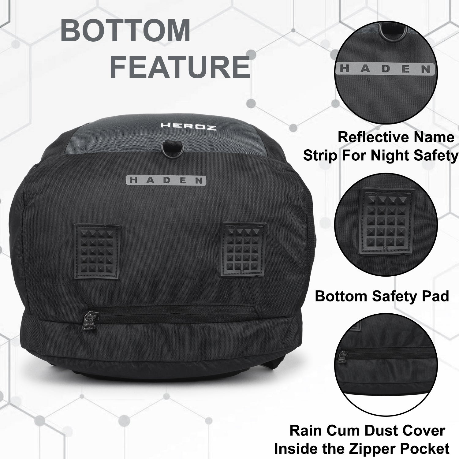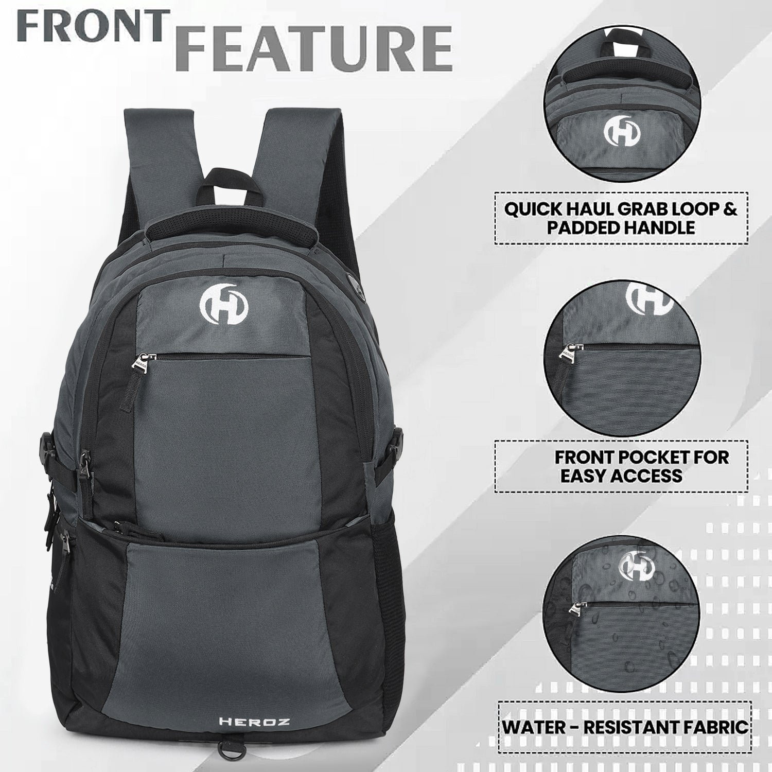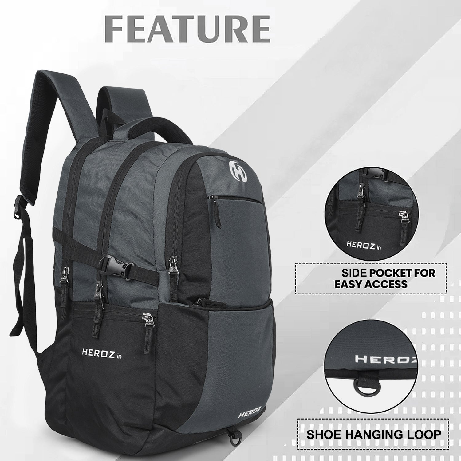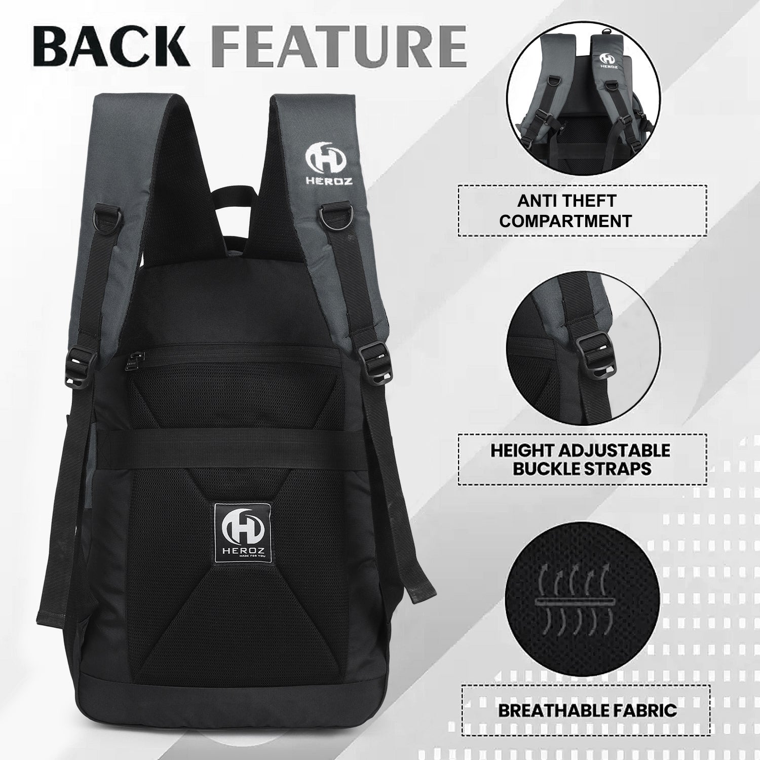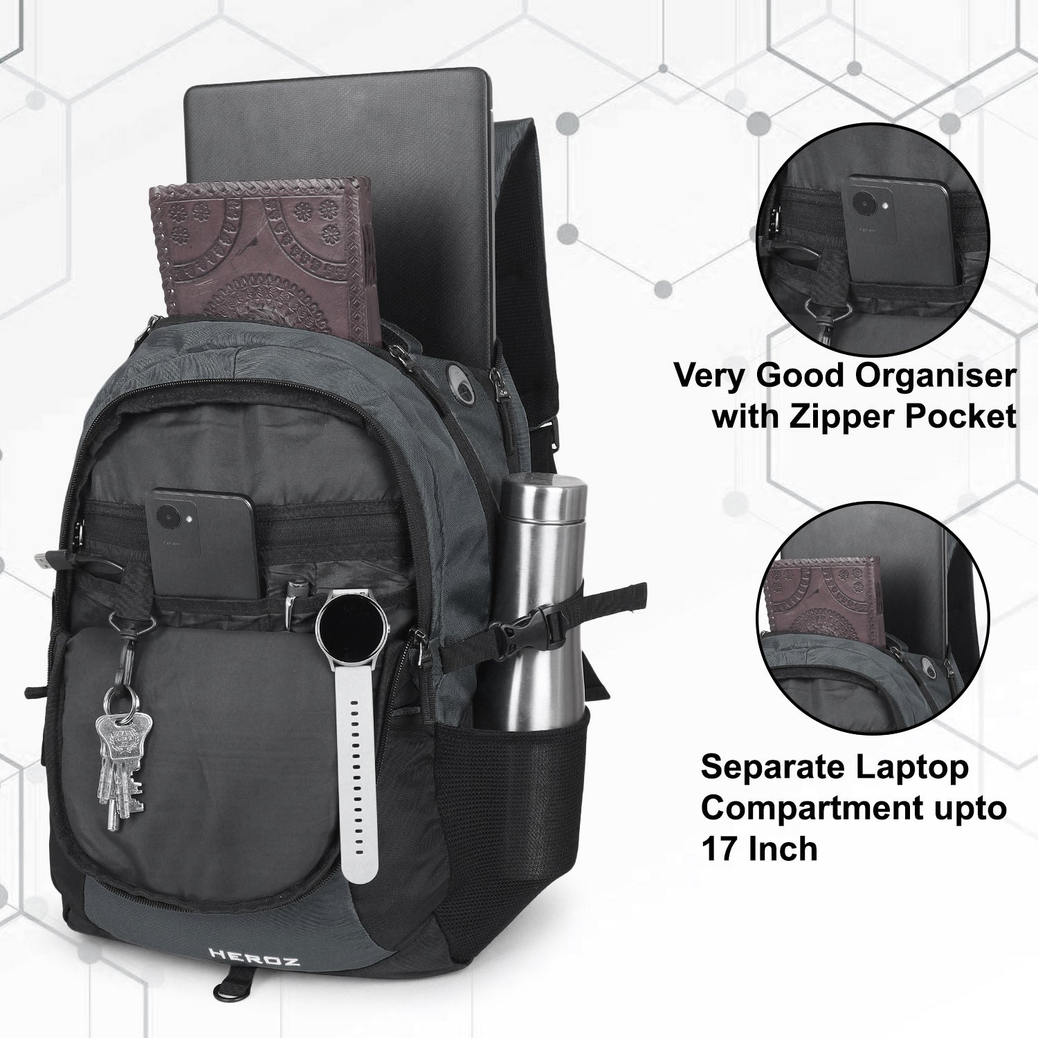 HEROZ Heden 40L laptop backpacks bags for men and women with USB Charing Point, rain cover with Anti Theft Pocket, Organizer, ideal for collage travel & office,17-inch sleeve (Black & Grey)